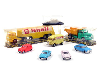 états de 'A' à 'C' - série MICRO MINIATURES - comprend : UNIC semi-remorque citerne 'SHELL' (petites traces d'oxydation sur les axes de roues), UNIC benne MARREL, PEUGEOT 204, 2 RENAULT FLORIDE, RENAULT 4L 'NOREV', RENAULT 16 & CITROËN 1200 kg 'SEMELFLEX' (carrosserie & châssis très déformés) - 3 modèles avec boîte