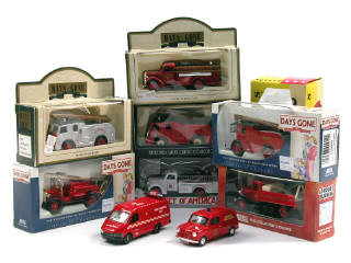 miniatures reproduisant notamment les modèles : FORD & DENNIS - on y joint une AUSTIN MINI van 'SOMERSET FIRE BRIGADE' de la marque VANGUARD