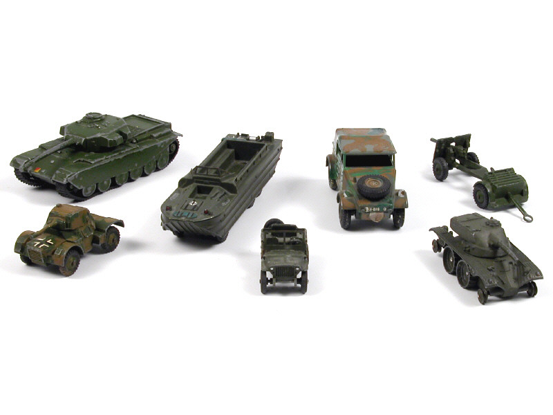 DINKY TOYS Ensemble de 6 engins militaires, un canon & une caisse à munitions kaki