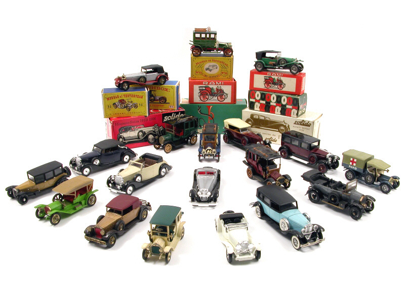 états de 'A' à 'B' - miniatures reproduisant les modèles - BUGATTI, ALFA ROMEO, SIZAIRE & NAUDIN, RENAULT, ROLLS ROYCE, HISPANO SUIZA, FIAT, BENZ, BENTLEY, MERCEDES, BIANCHI, LANCIA, SIMPLEX, CROSSLEY, PACKARD, DUESENBERG & JAGUAR - on y retrouve les marques : CORGI, RIO, MATCHBOX, RAMI, DUGU, ZISS MODELL & SOLIDO - 9 véhicules avec boîte - un tacot en état 'D' avec importantes traces de métal fatigue - petits manques