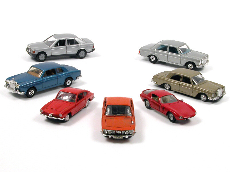 miniatures reproduisant les modèles : MERCEDES, BMW, ROLLS ROYCE & ALFA ROMEO - on y retrouve les marques : SABLON, CURSOR MODELL, CORGI TOYS, JOAL & MÄRKLIN - 2 véhicules avec jantes fondues dont un avec sigle de calandre manquant