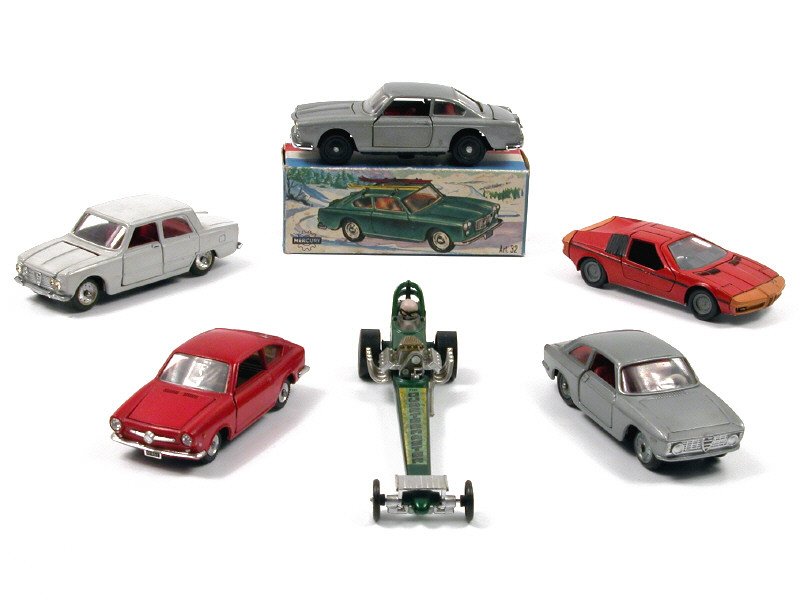 miniatures reproduisant les modèles : ALFA ROMEO, BMW, FIAT & LANCIA - on y retrouve les marques : MERCURY, SCHUCO, POLITOYS & CORGI TOYS - un véhicule avec boîte & un autre en état 'C' avec un phare manquant