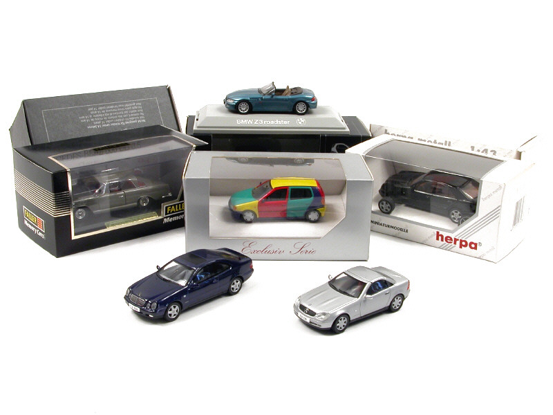 miniatures reproduisant les modèles : MERCEDES, BMW, SMART & VOLKSWAGEN - on y retrouve les marques : HERPA, FALLER & SCHUCO - un rétroviseur cassé sur une voiture - 2 boîtes non conformes