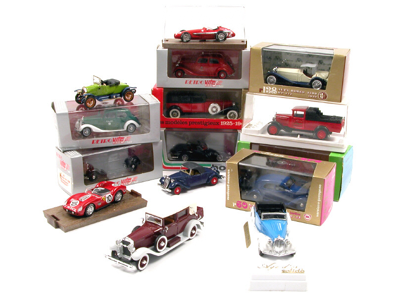 miniatures reproduisant les modèles : DUESENBERG, FERRARI, DELAHAYE, MASERATI, CITROËN, FIAT, ISOTTA FRASCHINI, FORD, LANCIA, MERCEDES & ALFA ROMEO - on y retrouve les marques : BRUMM, ELIGOR, VITESSE, SOLIDO, RIO & MODEL BOX - 3 boîtes en états 'c' - montants de pare-brise cassés avec glace manquante sur un véhicule