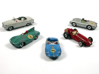 états de 'D' à 'E' - comprend : PEUGEOT 403 cabriolet (manque conducteur), DB PANHARD (manque pilote), PORSCHE SPYDER (traces de métal fatigue), MASERATI 250 (2 pneus non d'origine) & JAGUAR D (manque fixations du pilote)