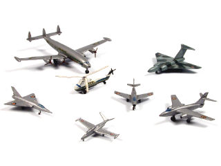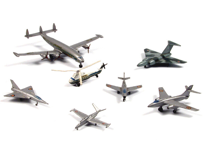 états de 'B' à 'D' - comprend : LOCKHEED CONSTELLATION (manque une hélice & son moyeu), VAUTOUR, MYSTERE IV, FAIREY DELTA, JAVELIN, FOUGA CM170R & SIKORSKY S58 (manque fixation de rotor, pales repeintes) - on y retrouve les marques DINKY TOYS, SOLIDO & C.I.J. - conditions 'B' to 'D' - includes: a LOCKHEED CONSTELLATION (missing one propellor & its hub), a VAUTOUR, a MYSTERE IV, a FAIREY DELTA, a JAVELIN, a FOUGA CM170R & a SIKORSKY S58 (missing rotor fixture, repainted blades) - includes the aforementioned makes