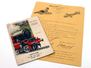 la couverture est en état 'c' - comprend l'ensemble de la production & les tarifications de la firme - on y retrouve notamment les trains, les canots & les accessoires ferroviaires HORNBY - avec une lettre d'époque accompagnant le catalogue (une annotation non d'origine)