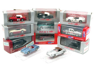miniatures reproduisant les modèles : AUSTIN HEALEY, FERRARI, CHEVROLET, MERCEDES, LANCIA & OPEL - on y joint 3 dioramas en carton de la marque