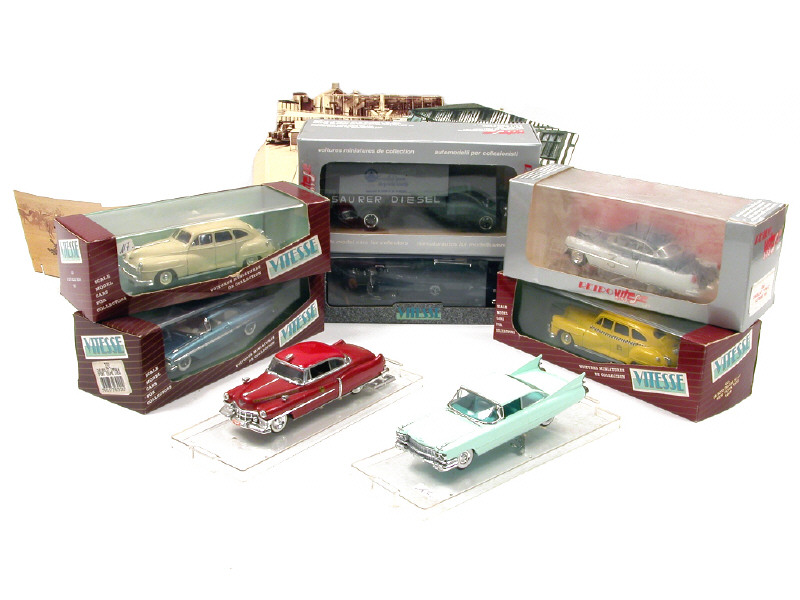 miniatures reproduisant les modèles : CADILLAC, CHEVROLET, DE SOTO & SAURER - 2 boîtes en état 'c' - on y joint 3 dioramas en carton de la marque