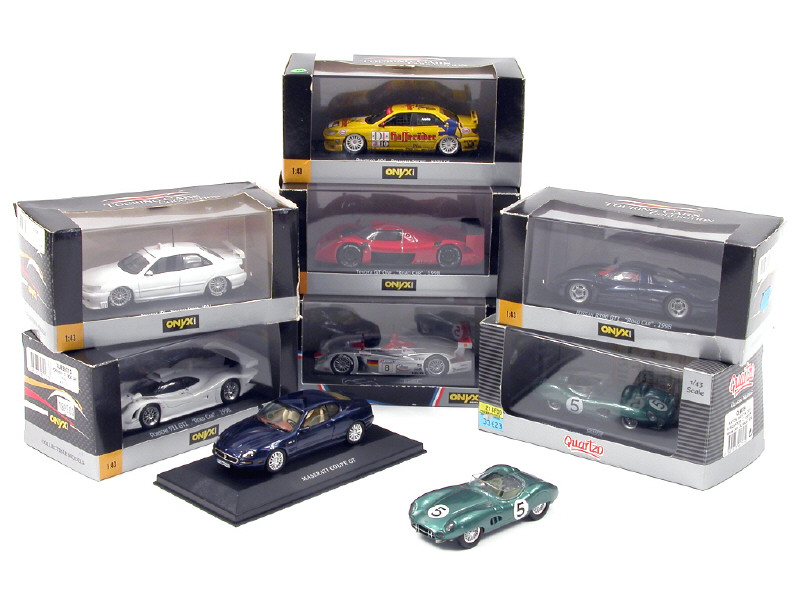 miniatures reproduisant les modèles : ASTON MARTIN, AUDI, PEUGEOT, NISSAN, MASERATI, PORSCHE & TOYOTA - on y retrouve les marques : IXO, ONYX & QUARTZO - un modèle sans boîte