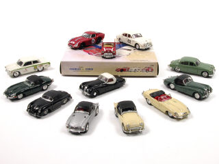 miniatures reproduisant les modèles : FERRARI, MGA, FORD, TRIUMPH, JAGUAR, PORSCHE & MINI - 3 modèles en coffret - décalques non d'origine apposés sur un modèle