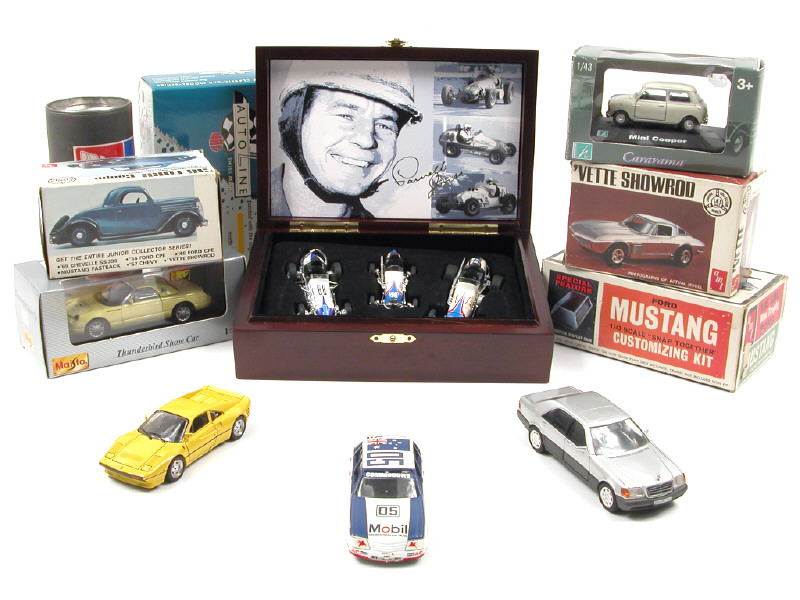 miniatures représentant notamment les modèles : FERRARI, MINI, MERCEDES, FORD, CHEVROLET & HOLDEN - on y retrouve les marques : GMP, AMT, DINKEM CLASSICS, CURSOR MODELL, HAG, CARARAMA & MAISTO - 3 véhicules en coffret & 2 autres à monter (boîte 'c') - on y joint une boîte vide de la marque AMT
