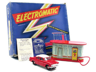 dimensions du coffret : 29 x 24,5 cm - contient une SIMCA ARIANE électrique & un poste de charge 'SHELL' en tôle lithographiée - avec batterie (non testée), cale de fond de boîte & notice - une extrémité de pare-chocs recollée - très légère déformation de la carrosserie