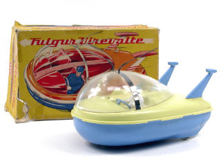 longueur 28 cm - moteur à pile (fonctionne) - en action, le vaisseau avance en contournant les obstacles - petites traces de colle sur la carrosserie (vraisemblablement d'origine) - manque une fixation de cockpit