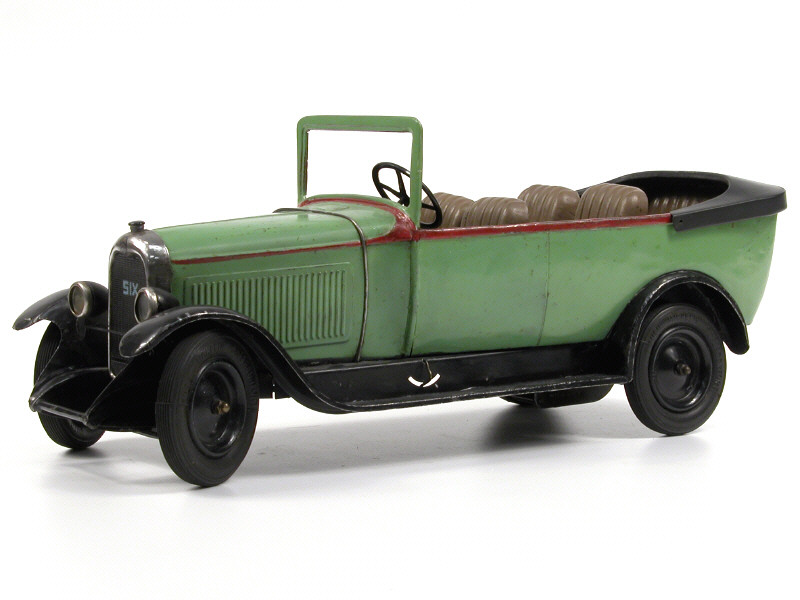 longueur 39 cm - moteur à clef (à revoir) - échelle 1/10ème - version sans pare-soleil & avec roues à pneus caoutchouc 'MICHELIN' - petites retouches - capote repeinte - manque manette de frein de moteur - SUPERBE !