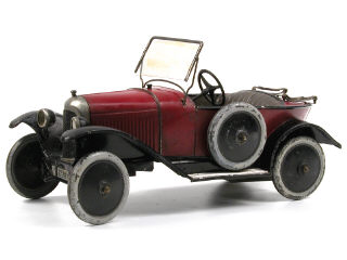 longueur 31 cm - moteur à clef (fonctionne) - première série de 1923 - grille de calandre en tôle - marchepieds en aluminium - roues en demi-coquilles représentant un pneu de type haute pression - parties repeintes - sangles de porte-bagages & papier collé représentant le tableau de bord non d'origine