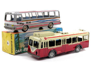 longueur 38 cm - moteur à ressort (fonctionne) - avec sonnerie & phares électriques (à revoir) - quelques pattes de fixation cassées - manque pannonceaux de toit, vitrage, ampoules, enjoliveurs de phares & perches - quelques traces d'oxydation