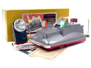 modèle fabriqué entre 1955 & 1960 - longueur 32 cm - moteur à piles (fonctionne) - en action, le véhicule avance & recule à chaque pression des pare-chocs - une cellule photo-électrique permet de modifier la direction lorsque celle-ci est éclairée par une lampe de poche (cette dernière est présente avec sa boîte d'origine), notices, petite fiche de contrôles techniques, 2 ampoules de rechange & un catalogue de la marque daté du 1er août 1967
