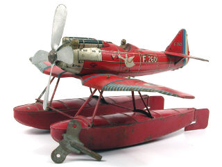 modèle réalisé en 1934 - envergure 48 cm - moteur à clef (fonctionne) - avec clef - une barre transversale de flotteurs dessoudée - 4 boulons de fixation non d'origine - traces d'oxydation