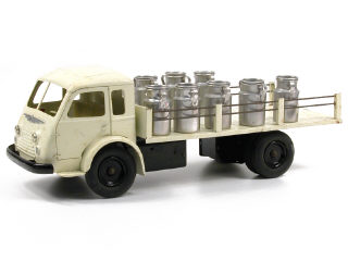 longueur 42 cm - version luxe de 1955 avec 8 pots à lait (manque un pot), moteur, phares électriques, direction & essieu arrière jumelé - marche avant & arrière - moteur à pile & éclairage (à revoir) - traces d'oxydation sur le châssis & sur les axes de roues avant - petite tache d'humidité sur la carrosserie