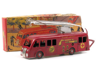 longueur 30 cm - moteur à clef (fonctionne) - version double échelle sans pompier de 1954 - sirène 2 tons - manque dévidoir - petites traces d'oxydation