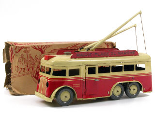 JOUSTRA (FRANCE) Trolleybus mécanique en tôle lithographiée 'MAIRIE-PLACE DU MARCHE' crème & rouge