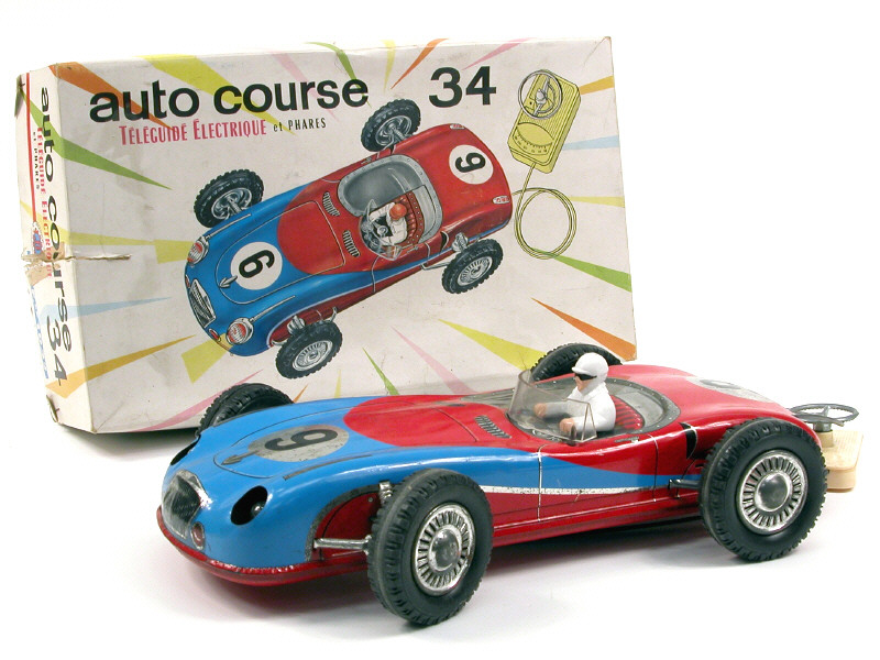 FRANCE JOUETS (FRANCE) 1032 Auto de course téléguidée en tôle lithographiée rouge & bleu