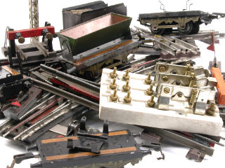 états de 'D' à 'E' - comprend notamment un wagon à benne-basculante, 3 wagons porte-grumes, un tender, 5 aiguillages, un croisement, un heurtoir, un signal rond & un ensemble de rails - avec manques & traces d'oxydation - on y retrouve notamment les marques JEP & HORNBY