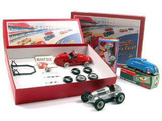 dimensions du coffret : 34,5 x 24,5 cm - contient : une voiture de course GRAND PRIX RACER 1070 avec roues démontées, outillages, cric, volant, notice, papillons de roues & 4 pneus de rechange - tous les éléments sont sur socle de boîte ficelés, jamais utilisés - avec surboîte de protection - fabrication contemporaine