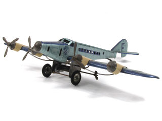 envergure 60 cm - moteur à ressort (fonctionne) - traces d'oxydation - manque une hélice & une partie de dérive arrière - en action, les hélices sont entraînées par le moteur