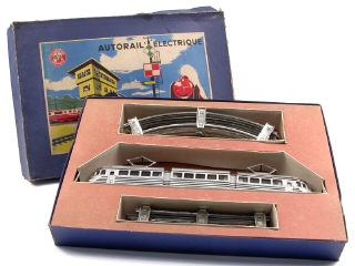 contient : un autorail électrique à 3 éléments (fonctionne poussivement), 6 rails courbes & 4 rails droits - importantes traces d'oxydation sur l'élément moteur