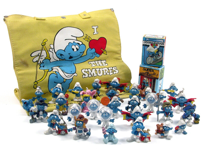 états de 'A' à 'B' - 2 modèles avec boîte - on y joint un sac en toile 'I LOVE THE SMURFS' en état 'C'