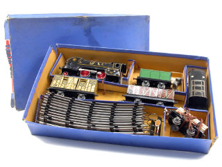 contient : une locomotive vapeur type 120 avec tender, un wagon-fourgon, un wagon-tombereau, un wagon porte-planches (en état 'C' avec chaînettes manquantes), un wagon-benne basculante & 12 rails courbes - petites traces d'oxydation - coffret non conforme au contenu