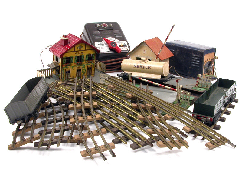 états de 'B' à 'R' - comprend : 3 wagons de marchandises, une petite gare en tôle lithographiée, un passage à niveau artisanal, 2 transformateurs (dont un avec boîte) & divers rails - avec manques - traces d'oxydation