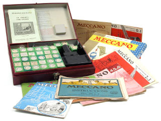 dimensions du coffret : 29,5 x 23 cm - avec notice - incomplète - on y joint 6 manuels de construction, un catalogue général MECCANO d'avant-guerre & un tarif en allemand de 1930