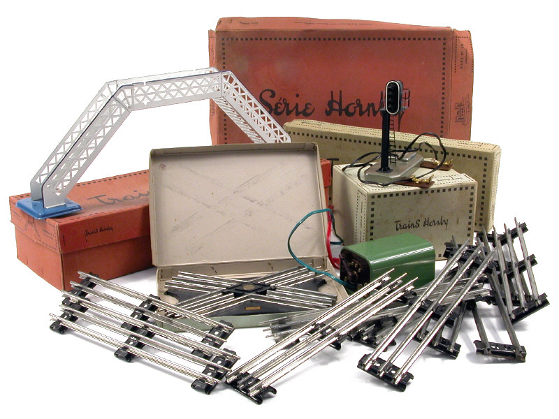 comprend : une passerelle n°2 avec sémaphores, une gare démontable n°18 (semble complète), un signal d'arrêt automatique, une paire d'aiguillages électriques, un croisement oblique électrique, un transformateur n°0 (sans boîte) & divers rails