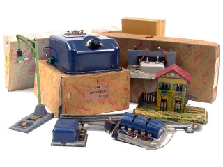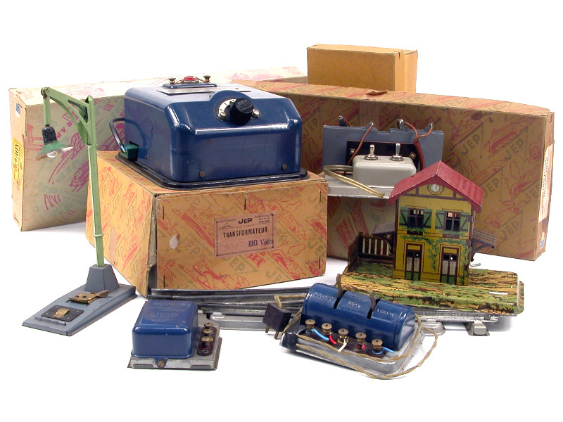 états de 'A' à 'B' - comprend : un transformateur n°554, une petite halte en tôle lithographiée, une cellule redresseuse (câble d'alimentation coupé), un lampadaire, un poste de commande & 2 aiguillages électriques - tous les éléments sont dans leur boîte à l'exception de la halte - quelques petites traces d'oxydation