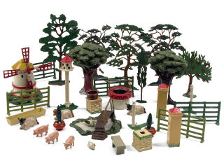 états de 'B' à 'E' - comprend : un moulin, un puit, une mare avec son pont, un pigeonnier, 4 pilastres, une auge, 7 barrières, 3 vaches, 5 cochons, 9 canards, un lapin, 2 bancs, 2 paniers & 14 arbres - on y retrouve notamment la marque BF