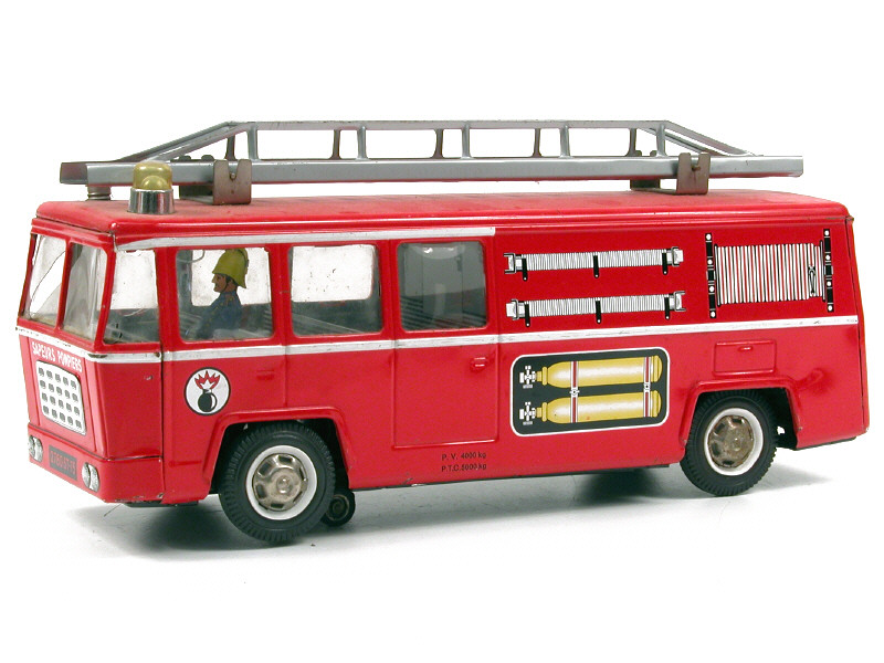 longueur 34 cm - moteur à pile (fonctionne) - avec bruiteur & gyrophares clignotants (manque un cabochon) - pare-brise fendu en 2 endroits - avec un petit manque - légères traces d'oxydation sur 2 axes d'échelle, un enjoliveur de roue, la barre de fermeture de trappe de la pile & l'interrupteur de fonctionnement