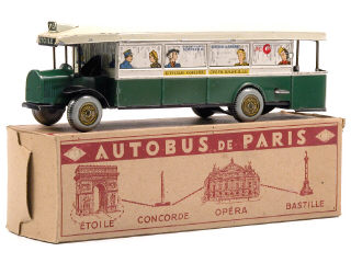 longueur 27 cm - moteur à ressort (fonctionne) - avec direction - belles illustrations & publicités sur les vitres - ce petit fabricant éphémère n'aurait fabriqué qu'un seul modèle, au début des années 50 - SUPERBE !
