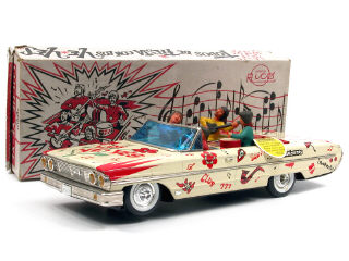 longueur 48 cm - moteur à piles (à revoir) - avec musique (fonctionne poussivement) & 4 personnages en caoutchouc - petite étiquette de recommandations présente - manque une poignée de portière - SUPERBE LITHOGRAPHIE !