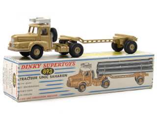 DINKY TOYS (FRANCE) 893 UNIC Saharien transport de pipe-lines (version avec jantes convexes & remorque ajourée) sable & blanc