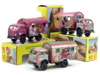 DIVERS (URSS) Ensemble de 3 MAZ 503 fourgon-transport d'animaux de cirque framboise métal & vert métal