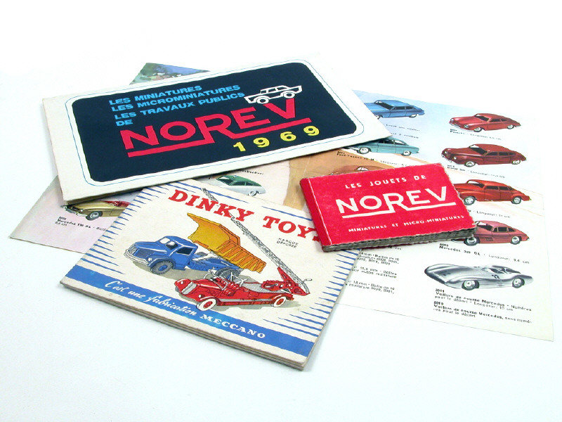 comprend : un catalogue DINKY TOYS FRANCE de 1955, un catalogue MÄRKLIN de 1958, un catalogue NOREV de 1969 & un petit fascicule de la marque NOREV comprenant diverses photographies de l'usine