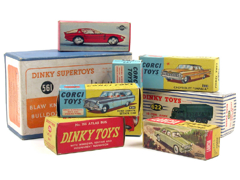 comprend : CHEVROLET IMPALA, FORD ZEPHYR break & ASTON MARTIN DB4 de la marque CORGI TOYS, BULLDOZER BLAW KNOX, 10 TON ARMY TRUCK & ATLAS KENEBRAKE bus de la marque DINKY TOYS, LANCIA APPIA & ALFA ROMEO CANGURO de la marque MERCURY