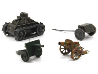 comprend : un char d'assaut avec moteur à clef (à revoir), 2 canons & un caisson à munitions - on y retrouve notamment les marques : GAMA & BRITAINS - petites traces d'oxydation
