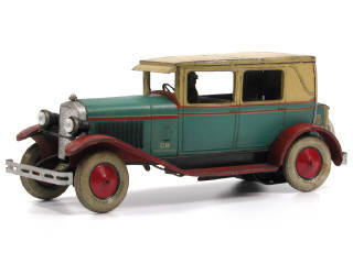 longueur 37 cm - moteur à ressort (à revoir) - version avec phares électriques - traces d'oxydation - calandre, pare-chocs, jantes, plaque minéralogique arrière & roue de secours repeints - bouchon de radiateur & 2 fixations de roues non d'origine