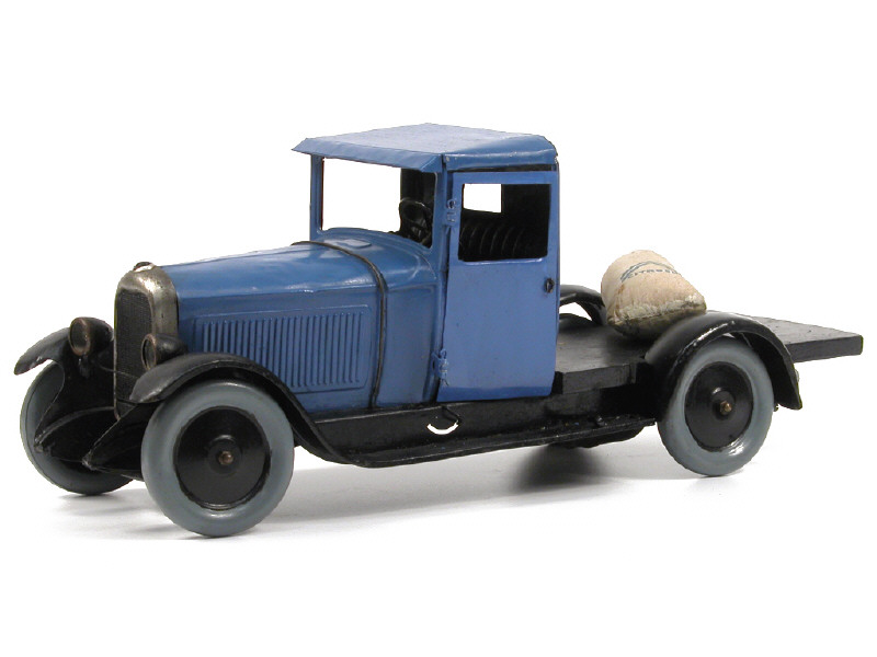 longueur 44 cm - moteur à clef (fonctionne) - plateau en bois - avec un sac - bouchon de radiateur, porte conducteur, quelques fixations & toit de cabine non d'origine - roue de secours ajoutée - ailes arrière non conformes - petites traces d'oxydation