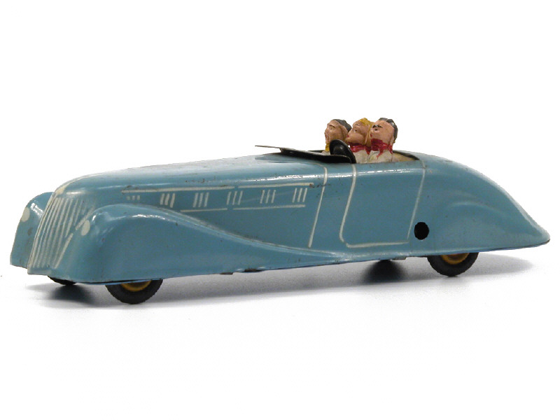 longueur 23 cm - moteur à clef (fonctionne) - version de 1937, avec 3 personnages & sans logo - pare-brise abaissé
