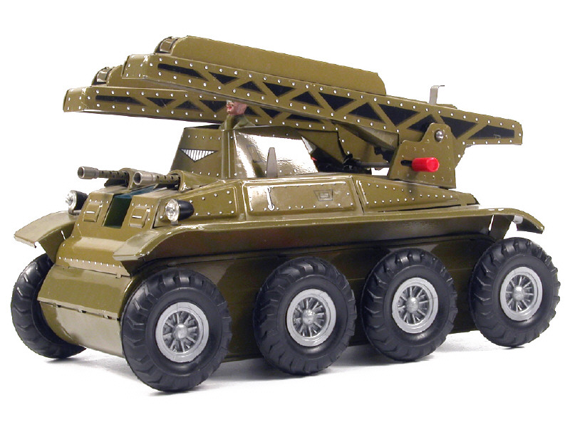 longueur 27 cm - moteur à clef (fonctionne) - avec bruiteur - grâce à un système de ressort, les 2 fusées (manquantes) sont éjectées de leur rampe de lancement - système de pierre à briquet des mitrailleuses à revoir